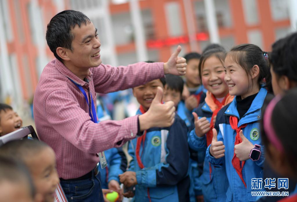 4月15日,杨明回访贵州省毕节市黔西县莲城街道坪子小学时与学生们互动交流。