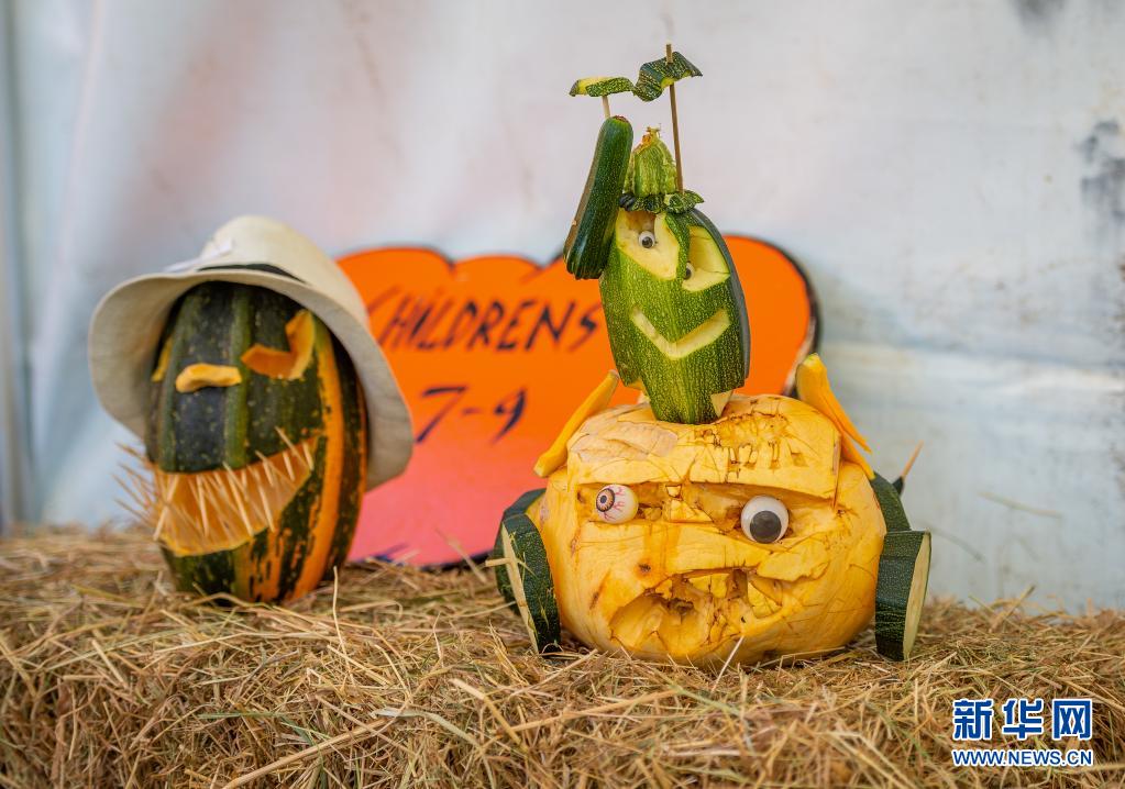 这是4月18日在新西兰南岛克赖斯特彻奇的小河镇举行的南瓜节上拍摄的孩子制作的“最艺术南瓜”参选南瓜。