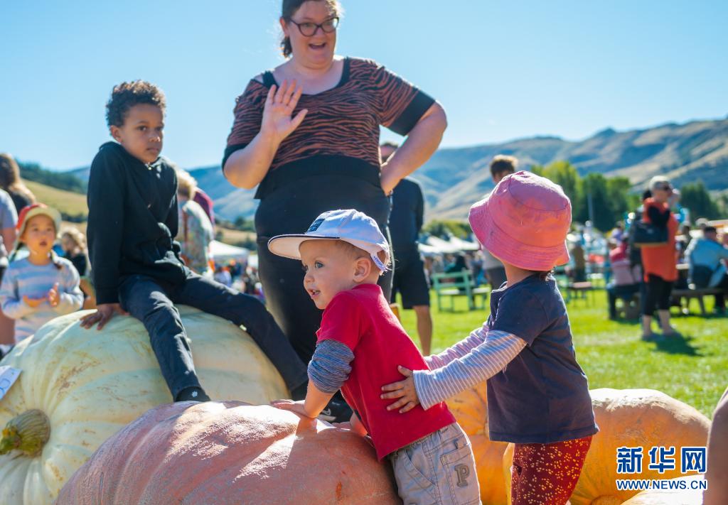 4月18日,在新西兰南岛克赖斯特彻奇的小河镇举行的南瓜节上,孩子们和参选“最大南瓜”的大南瓜玩耍。