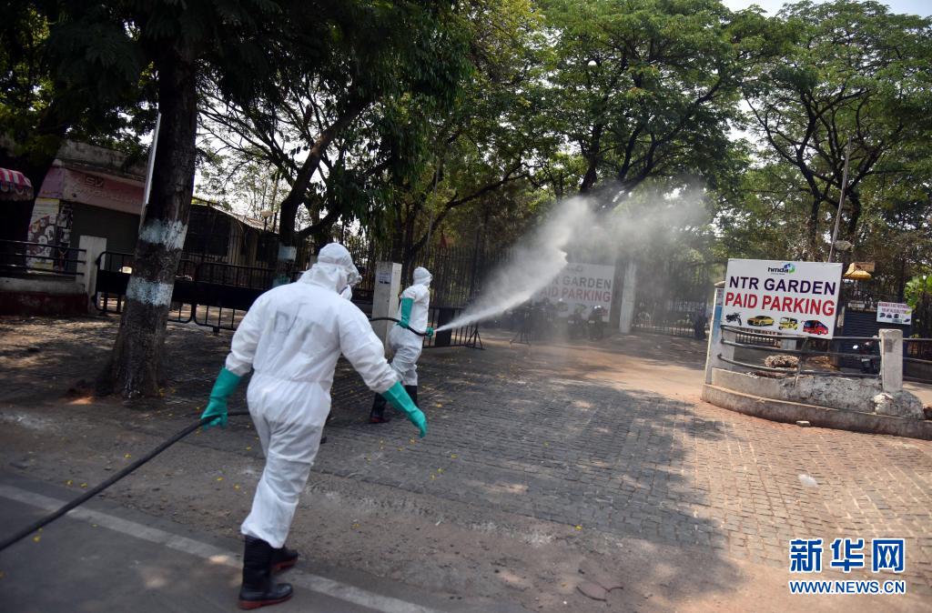 4月18日,救灾应急部队成员在印度海得拉巴进行消毒作业。