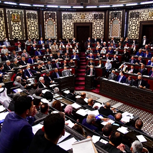 这是4月18日在叙利亚大马士革拍摄的议会会议现场。