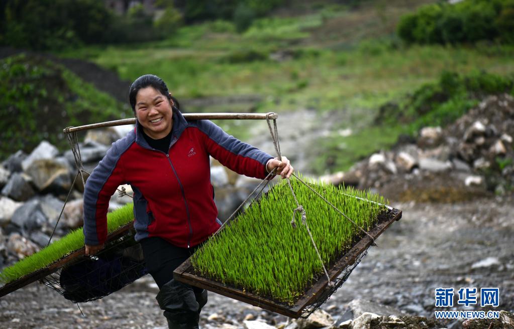 4月19日,贵州省黔南布依族苗族自治州福泉市凤山镇羊昌河村的村民在运送秧苗。
