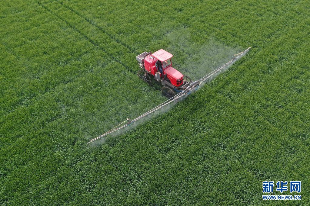 4月18日,安徽省蒙城县代敏农机合作社的农机手驾驶自走式喷杆喷雾机,为双涧镇阜西村的种粮大户进行小麦赤霉病防控作业(无人机照片)。
