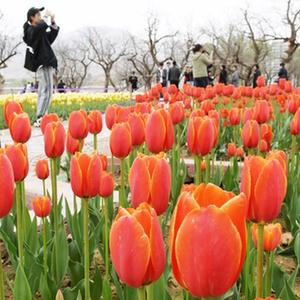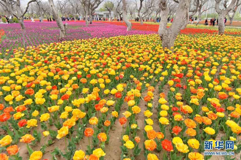 近日,甘肃省永靖县刘家峡镇黄河花堤上种植的大面积郁金香竞相盛开,吸引了大批游客前来踏青赏花。