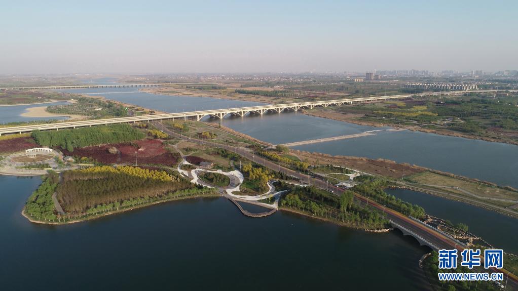 这是4月13日拍摄的生态修复后的滹沱河景色(无人机照片)。