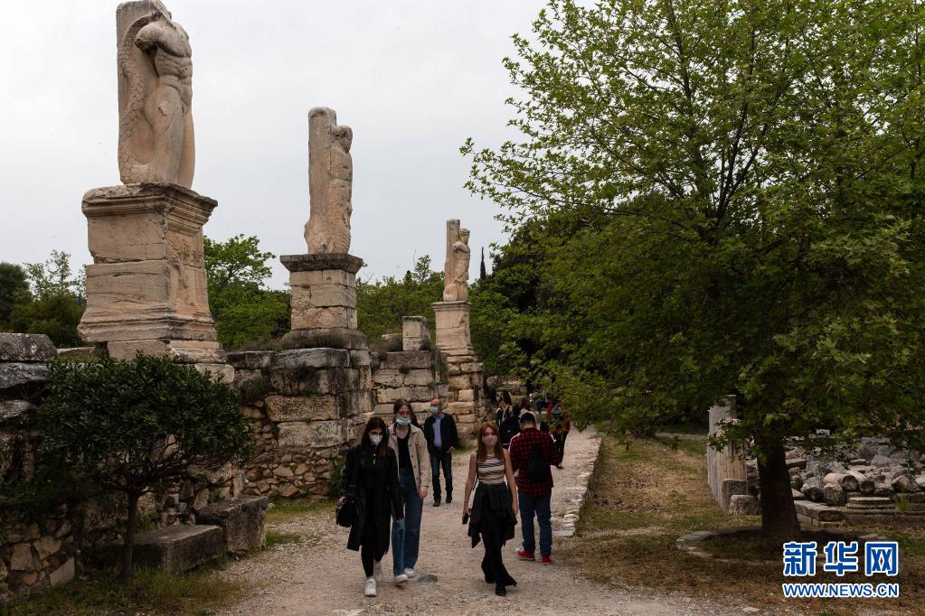4月18日,游客在希腊首都雅典的赫菲斯托斯神庙参观。