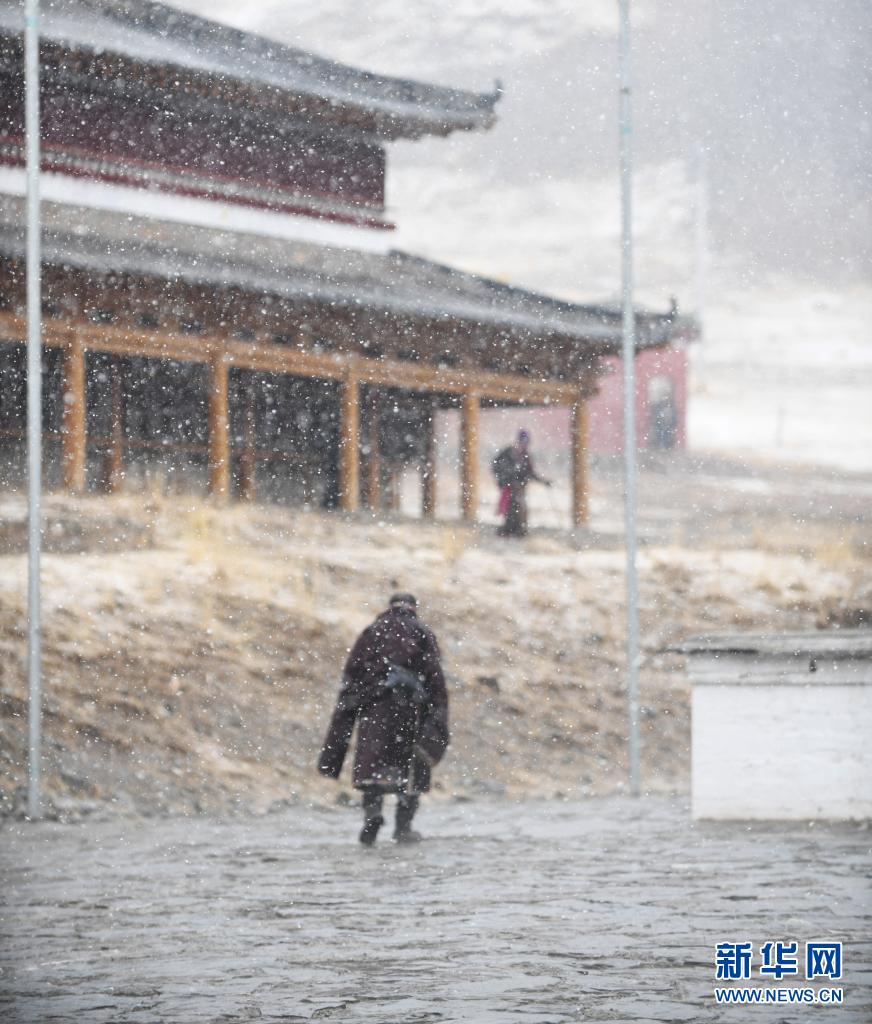 这是4月19日在青海省果洛藏族自治州甘德县拍摄的雪中行走的村民。新华社记者 张曼怡 摄