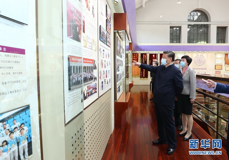 4月19日,在清华大学建校110周年校庆日即将来临之际,中共中央总书记、国家主席、中央军委主席习近平来到清华大学考察。这是习近平在清华大学西体育馆体育荣誉室察看历史照片、实物展览,了解体育馆保护利用、学校继承发扬优良传统、开展体育教育等情况。新华社记者 鞠鹏 摄