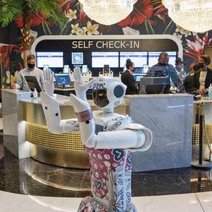 4月19日,机器人员工莱克茜在南非约翰内斯堡一间酒店大堂为旅客提供服务。