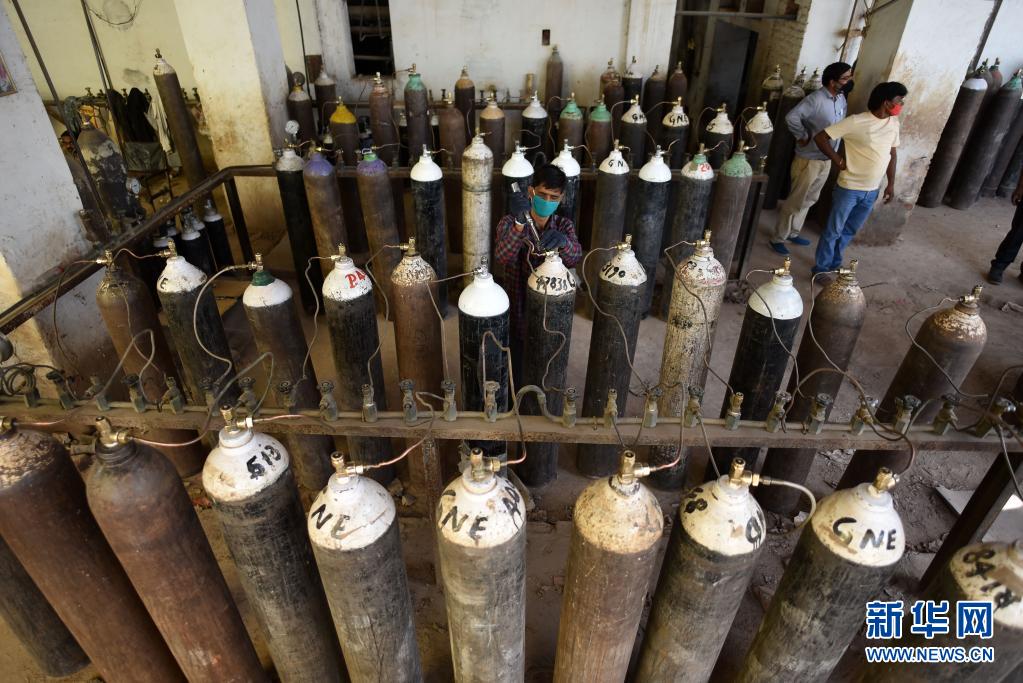 4月19日,工作人员在印度普拉亚格拉杰为医用氧气罐充氧。