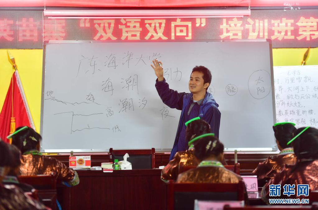 在广西融水苗族自治县杆洞乡党鸠村乌英苗寨,广东海洋大学教授陈涛在给夜校班的妇女们上课(2020年10月16日摄)。