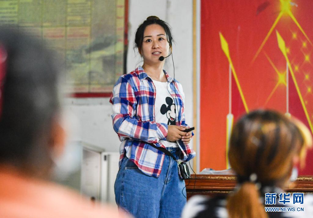 在新疆喀什地区莎车县伊什库力乡阔坦墩村,驻村工作队队员史娜为当地农民进行就业技能培训(2020年5月23日摄)。