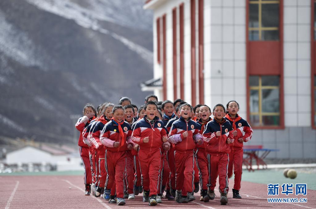 青海省果洛藏族自治州甘德县下贡麻乡寄宿制中心小学学生在上体育课(2021年3月17日摄)。2016年以来,青海省累计向青南等地区投资129亿元,建设校舍320万平方米,办学条件显著改善。