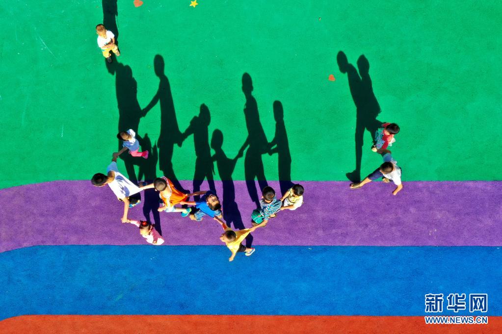 孩子们在山西省太原市社会(儿童)福利院内玩耍(2019年8月31日摄,无人机照片)。