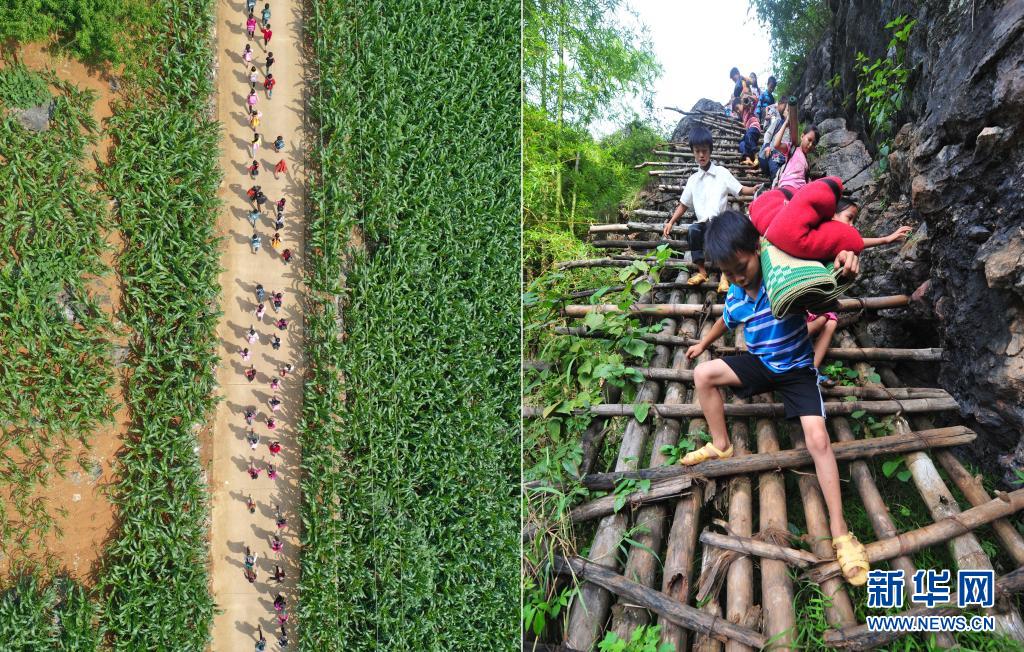 这是一张拼版照片。左图:在大化瑶族自治县板升乡弄勇村,孩子们走在放学路上(2019年5月10日摄,无人机照片);右图:在弄勇村弄顶屯,孩子们扛着生活用具,爬悬梯上学(2012年9月3日摄)。目前,弄勇村所有的屯都已告别没有公路的历史。