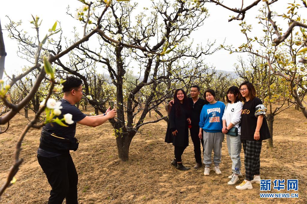 4月19日,游客在山西省原平市同川镇的梨园里赏花拍照。近日,位于山西省原平市的万亩梨花正值盛花期,吸引众多游客前来赏花踏青。新华社记者 柴婷 摄
