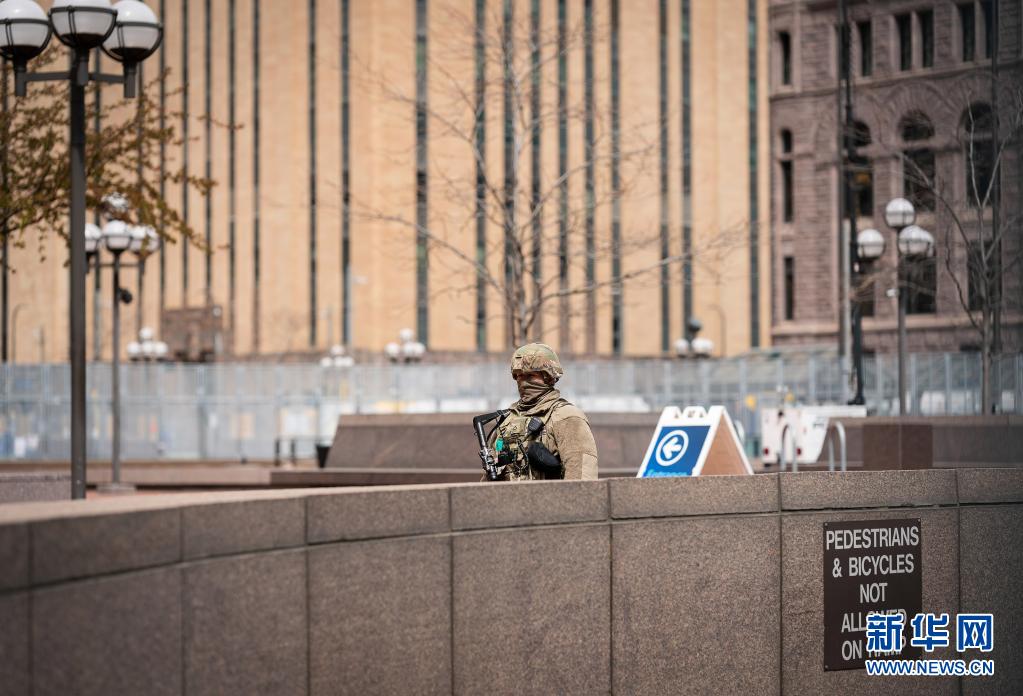4月19日,国民警卫队成员在位于美国明尼阿波利斯市的法庭周边执行安保任务。