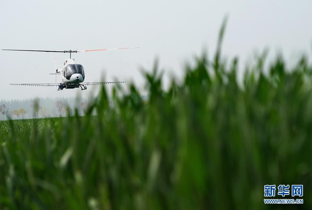 在河南省商水县南陵村一处高标准农田里,直升机在进行植保作业(4月15日摄)。