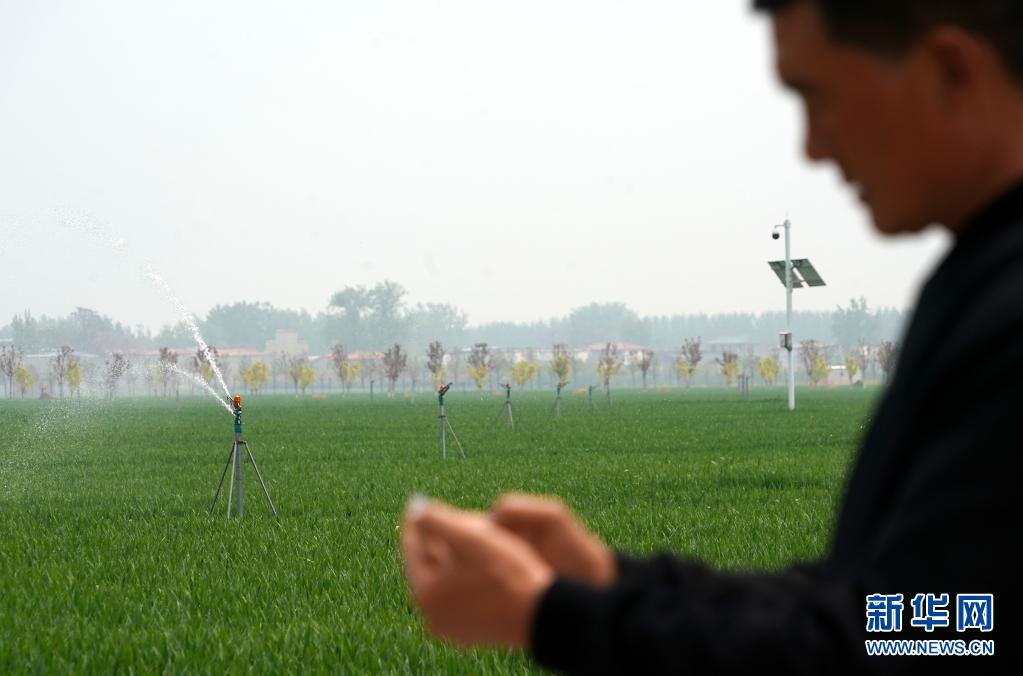 在河南省商水县南陵村一处高标准农田里,种粮大户邱守先使用手机操控设备对小麦田进行喷灌(4月14日摄)。