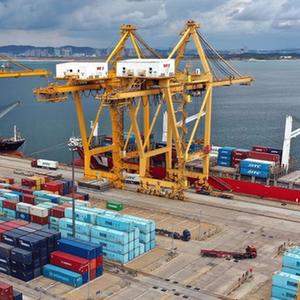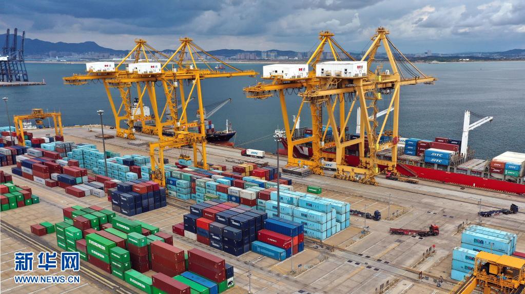 货轮在大连港大连集装箱码头有限公司港口装卸集装箱(2020年9月24日摄,无人机照片)。新华社记者 姚剑锋 摄