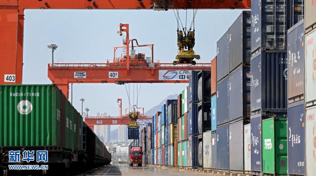 大连港区中铁联集大连中心站里的货车在装载集装箱(2020年4月8日摄)。新华社记者 姚剑锋 摄
