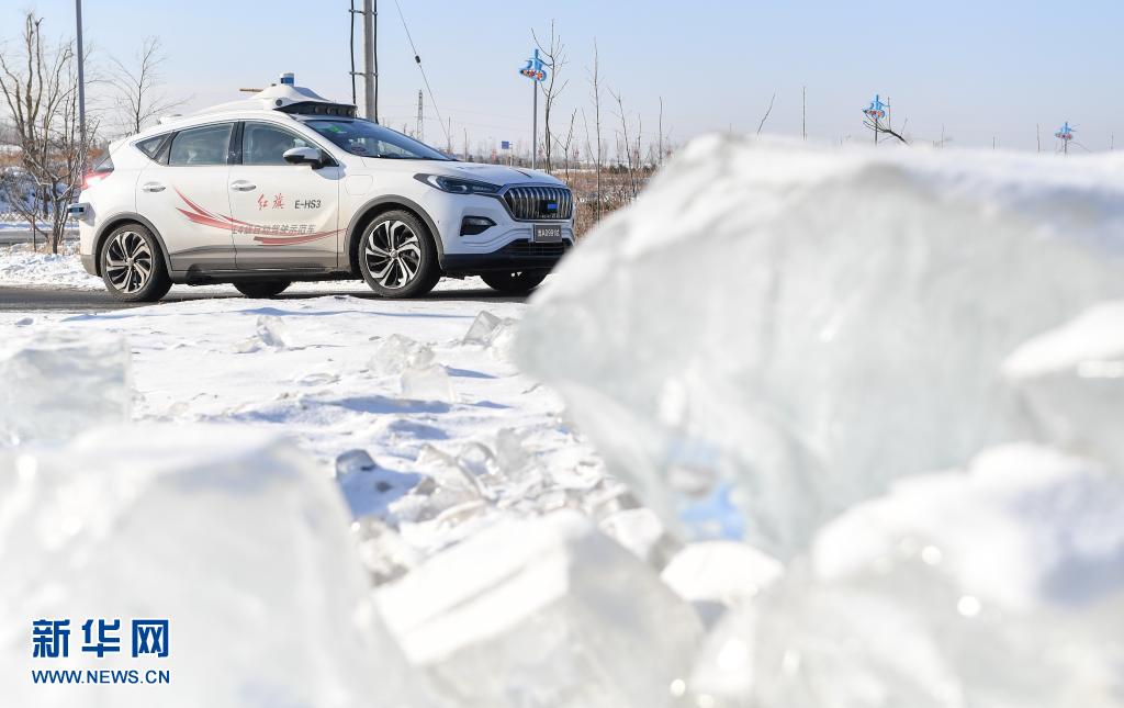 “红旗越野赛”车队车辆在2021中国长春(国际)无人驾驶汽车冰雪挑战赛中行驶(1月14日摄)。新华社记者 张楠 摄
