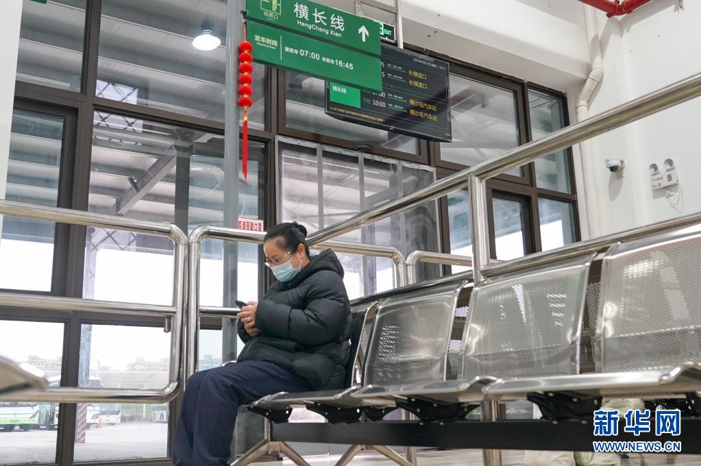 施华在长兴岛汽车站内候车(4月14日摄)。
