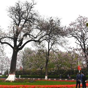 这是4月20日在河南省开封市兰考县焦裕禄干部学院附近拍摄的泡桐花(无人机照片)。新华社记者 郝源 摄