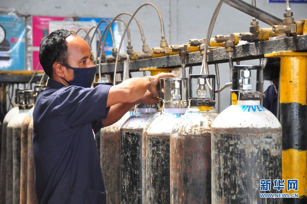 4月20日,工作人员在印度班加罗尔为医用氧气罐充氧。