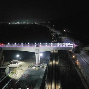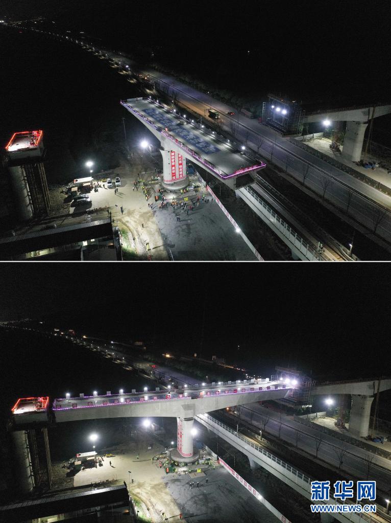 4月21日凌晨,由中铁四局承建的湖杭铁路大圩里特大桥上跨杭临城际铁路、杭瑞高速、G329国道连续梁逆时针转动82度,安全跨越既有线,实现精准对接到位,这是湖杭铁路首个成功转体的连续梁。