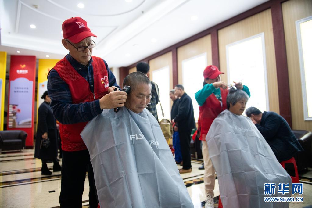 4月21日,在望城名都社区公共服务大厅,志愿者胡显任(左一)和陆君给邻居免费剪头发。