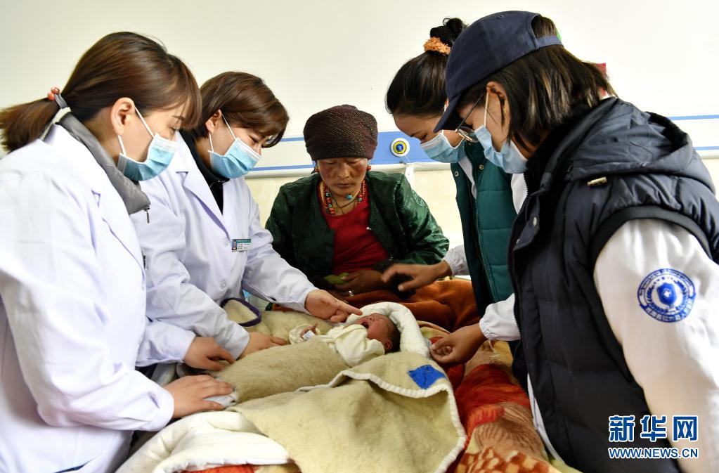 4月21日,在聂拉木县人民医院,山东省烟台市第五批援藏医疗队队长魏德贤(左二)、护士长崔雯(左一)和当地医院妇产科主任边巴普尺(右二)、妇产科医生扎桑德吉(右一)查房。