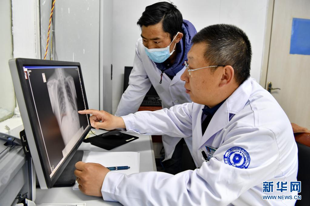 4月21日,山东省烟台市第五批援藏医疗队成员赵文雷(右)指导当地医院放射科助理医师普布次仁看片。