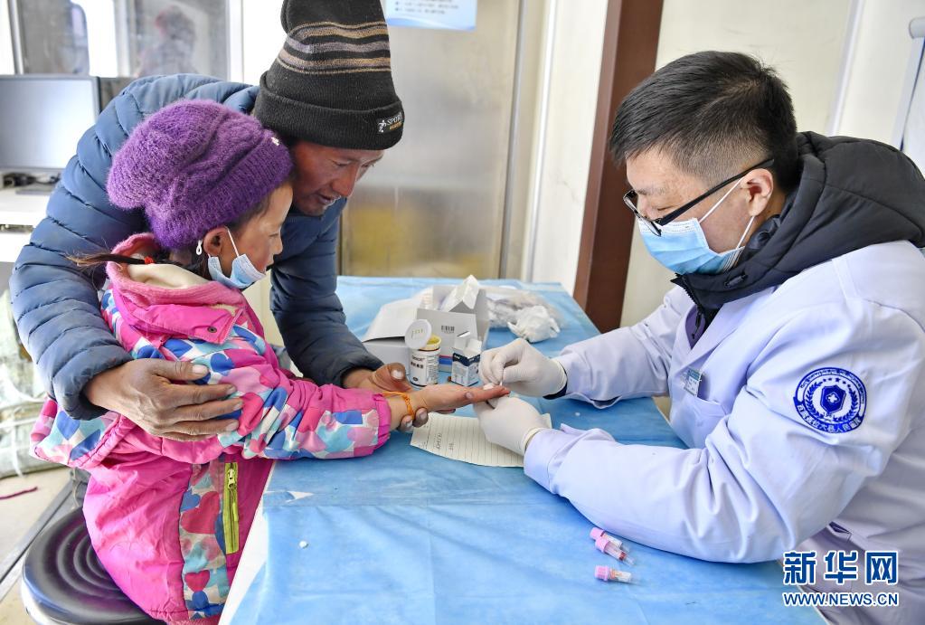 4月20日,在巡诊车上,山东省烟台市第五批援藏医疗队医生焦有诚(右)为亚来乡欧热村村民采血检验。