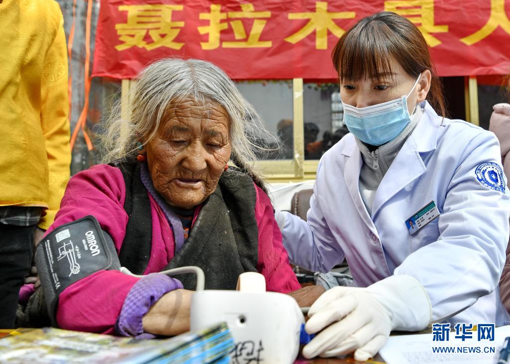 4月20日,山东省烟台市第五批援藏医疗队成员崔雯(右)为亚来乡欧热村村民测量血压。