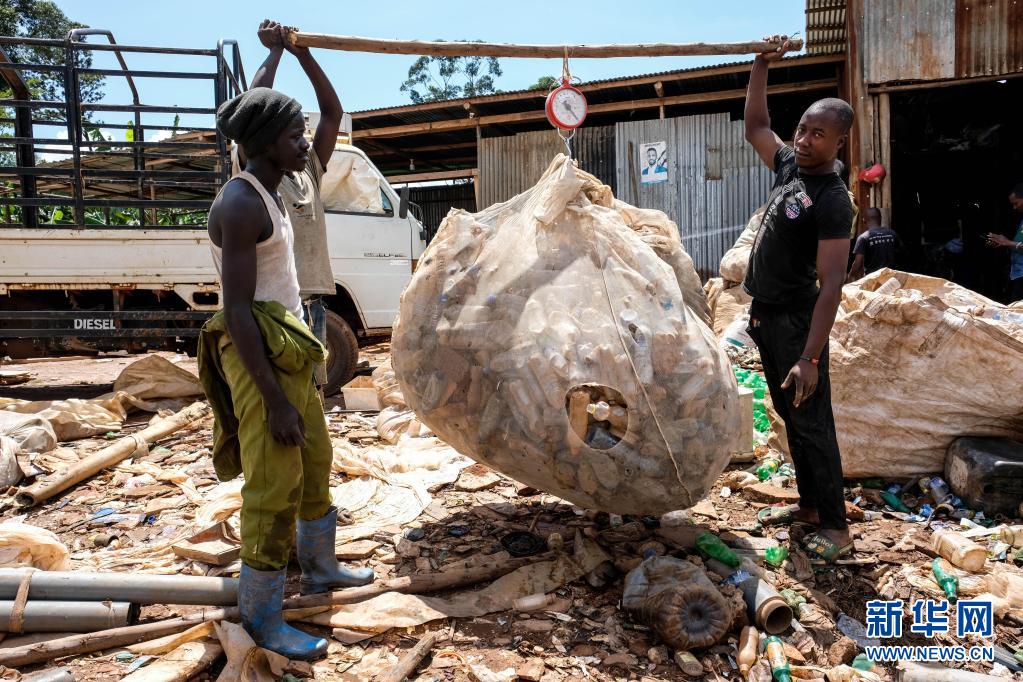 3月24日,“乌干达生态方式”回收中心工作人员在首都坎帕拉回收废旧塑料物品。