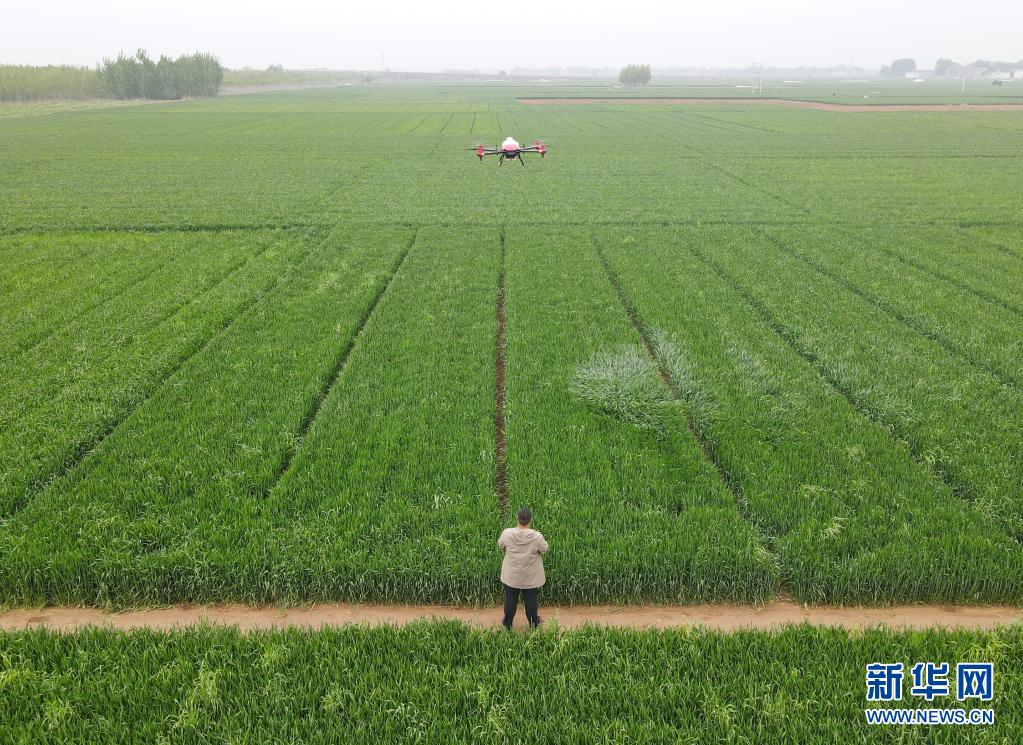 4月21日,在位于邯郸市成安县的垚岸农业科技有限公司,技术人员操控植保无人机在麦田作业(无人机照片)。