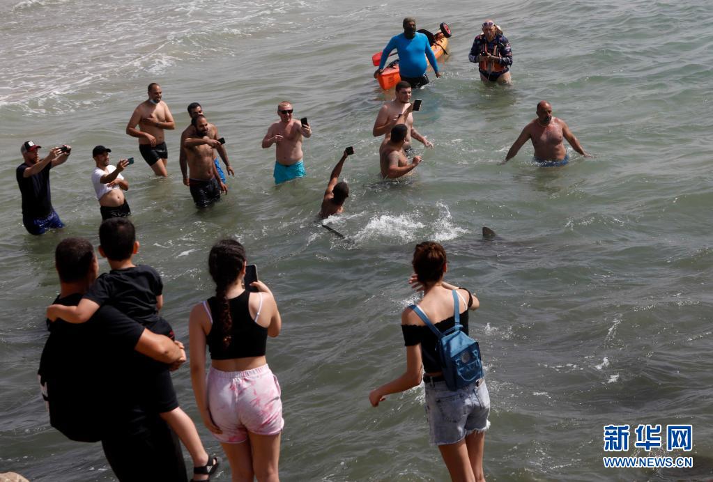 4月20日,在以色列北部城市哈代拉的海边,鲨鱼从人们身边游过。