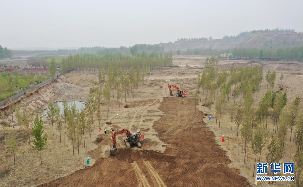 4月21日,中交第一航务工程局有限公司的工人在迁安市境内的西沙河治理工程工地施工(无人机照片)。