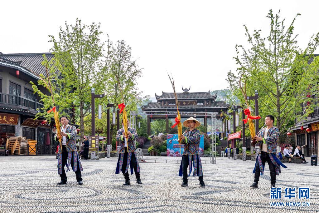 4月21日,演员在丹寨县万达小镇景区表演民族歌舞。