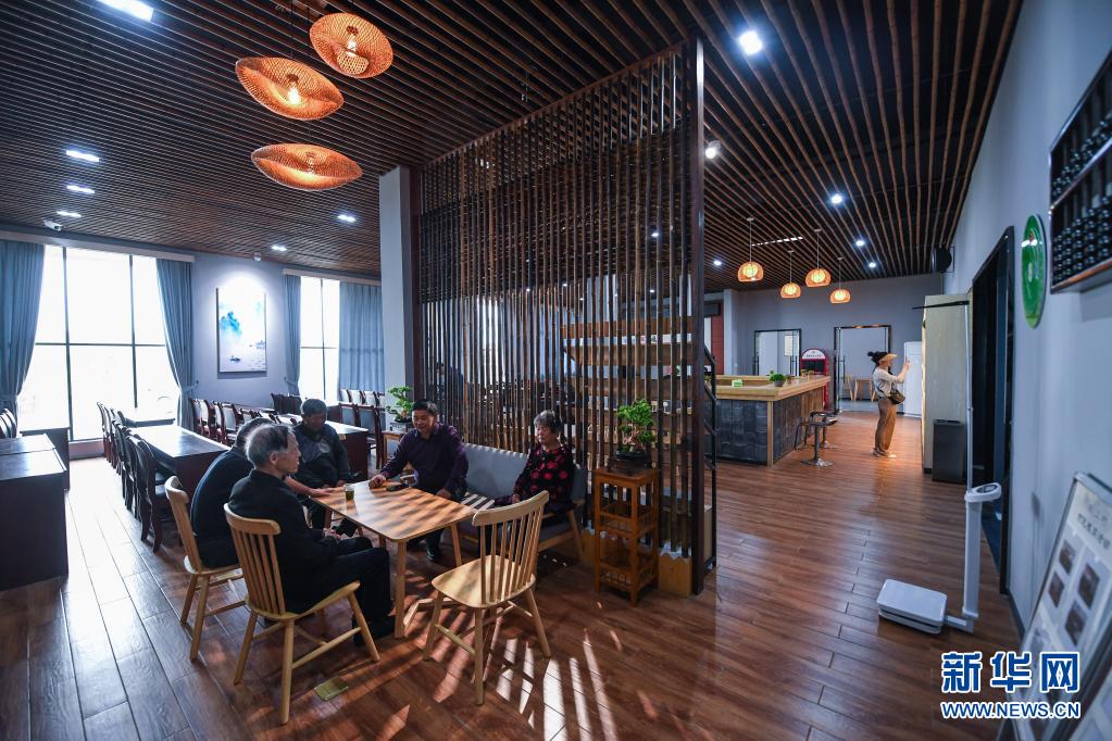 4月21日,村民在诸暨市枫江村新建的文化礼堂内聊天。枫江村近年来通过“一事一议”财政奖补不断完善村基础配套设施,改造升级村级道路、文化礼堂、文化公园、村级医疗、旅游厕所等,生活污水治理覆盖全村。