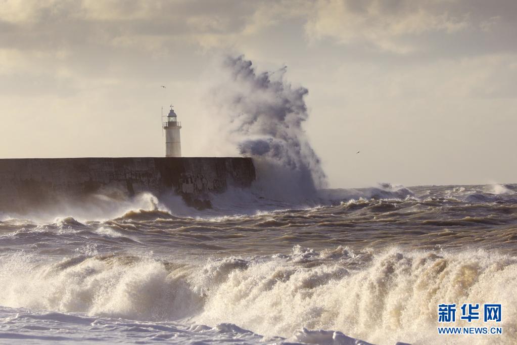 2020年8月26日清晨,风暴“弗朗西斯”过境英国,海浪拍打着纽黑文港口的堤岸。风暴“弗朗西斯”给英国多地带来强降雨和强风天气。