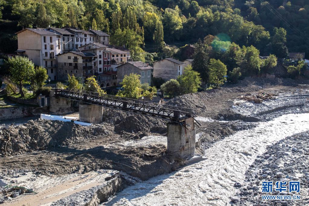 这是2020年10月12日拍摄的法国南部圣马丹韦叙比遭受暴雨洪水破坏的景象。法国和意大利交界地区遭遇暴雨及洪水袭击,造成多处房屋、桥梁和公路被毁。