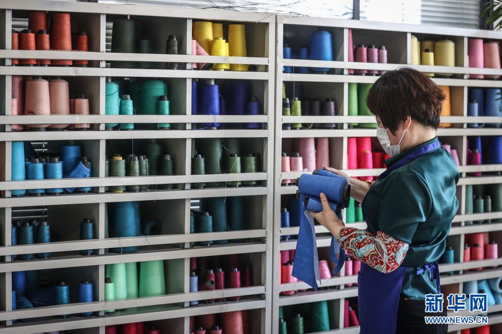 4月7日,工作人员在葫芦岛斯达威集团泳装制样车间挑选材料。
