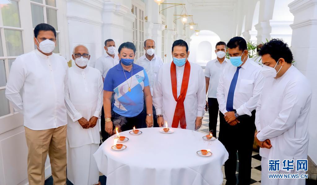 4月21日,在斯里兰卡科伦坡总理府,马欣达·拉贾帕克萨(前排右三)与政府官员一起举行仪式缅怀连环恐怖袭击事件的死难者。