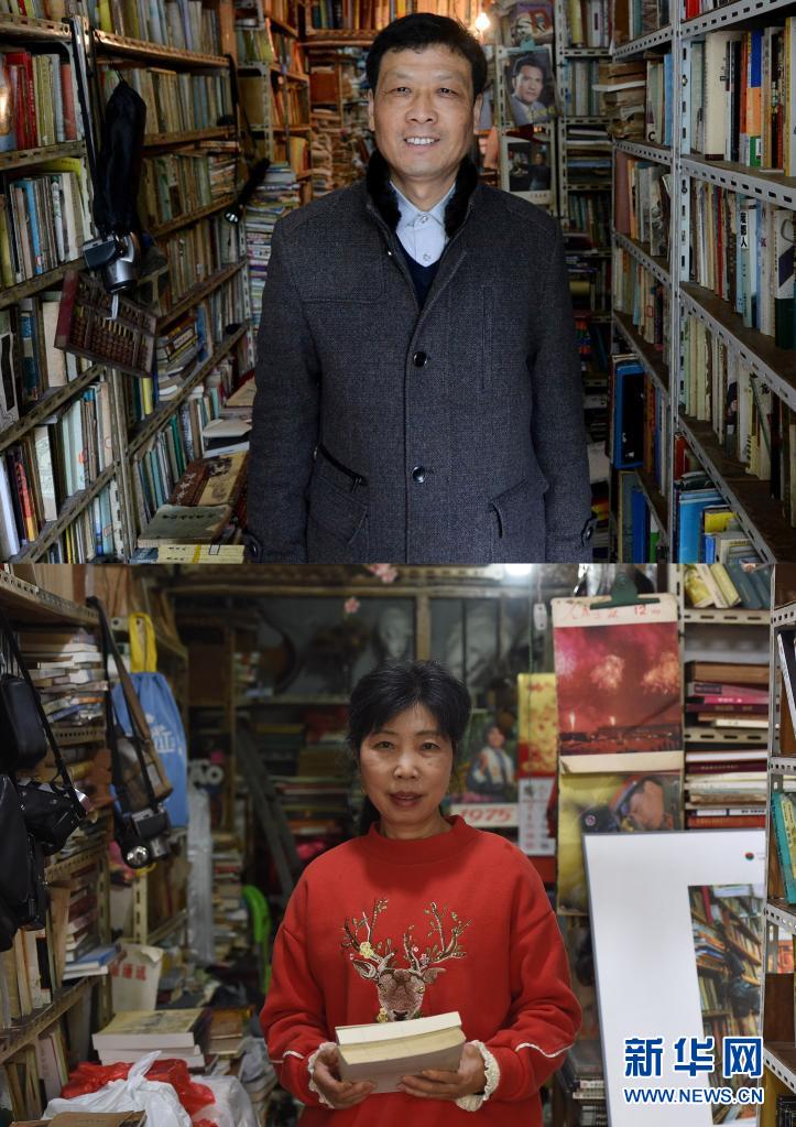 这是一张拼版照片。上图是2013年4月21日,朱传国在增知旧书店内留影(新华社记者张端 摄);下图是2021年4月20日,陈桂霞在增知旧书店内留影(新华社记者周牧 摄)。