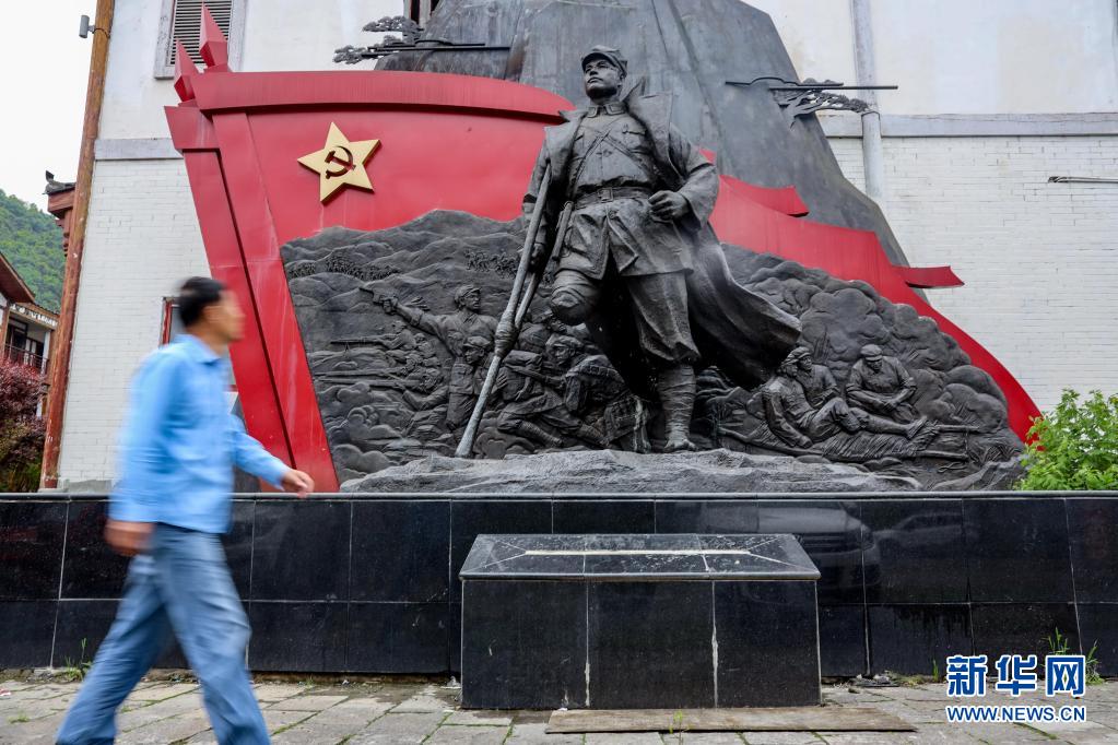4月20日,参观者从钟赤兵纪念广场钟赤兵雕像前经过。