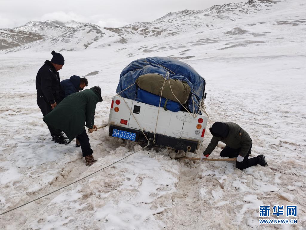 2020年3月,袁广明(右一)和巡山队员一起在可可西里巡山途中解困被陷车辆。
