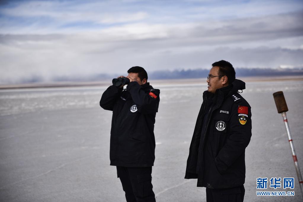 2016年12月1日,袁广明(右)和队友在可可西里腹地查看新生湖水位。