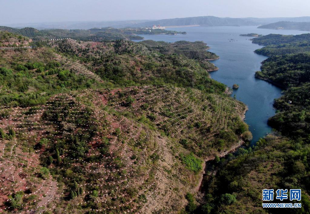 这是济源市大峪镇方山村的困难地造林基地,山坡上白色的鱼鳞坑整齐排列,坑里的白皮松树苗伫立,遥望着山下清澈平缓的黄河小浪底水库(4月19日摄,无人机照片)。新华社记者 李安 摄